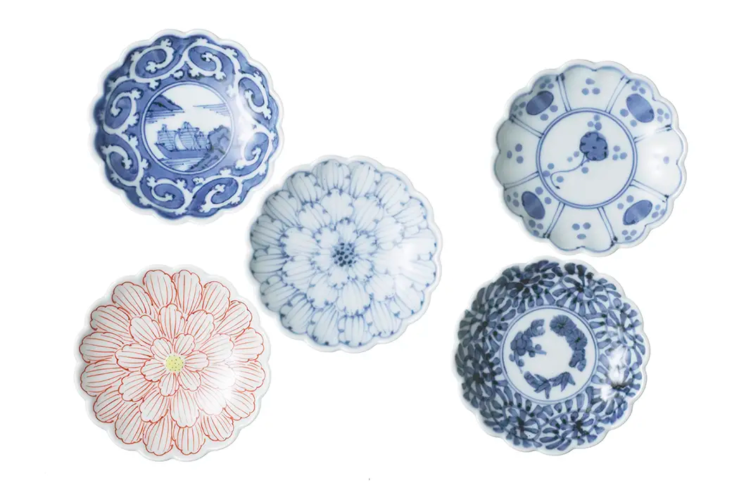 全国の蕎麦店から絶大な人気と信頼を得ている、“蕎麦猪口”名窯元。これまでに制作した蕎麦猪口はなんと1400種類!古典柄を独自にアレンジした、楽しい染付の絵のセンスが豆皿にも生かされています。