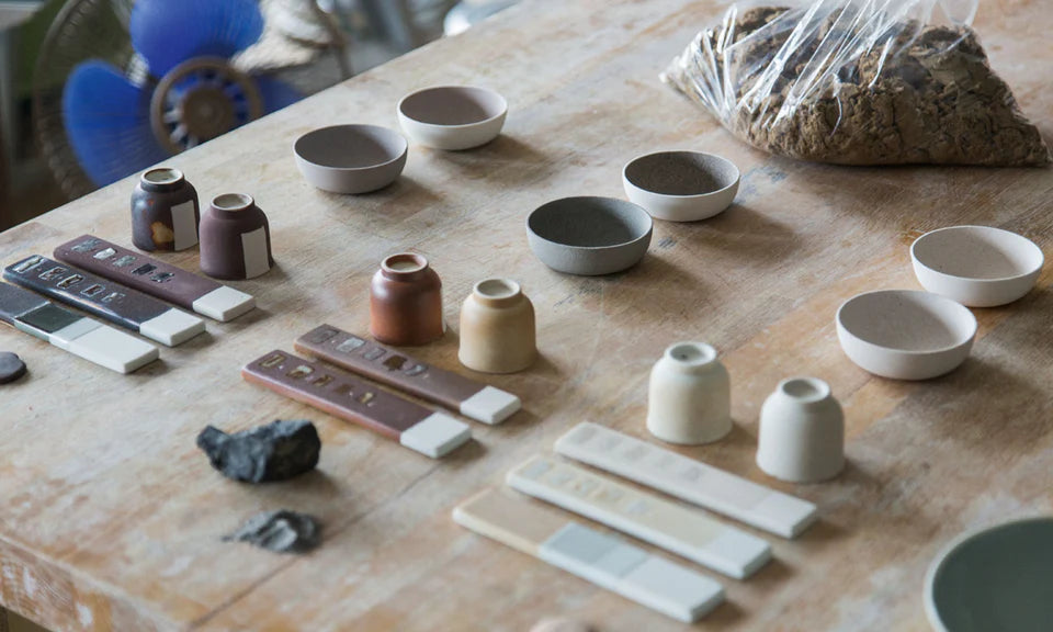 カースティーは有田に滞在中、数百のテストピースを作りました。自然豊かな有田近辺の野山に入り、その地で採れる土や石を採取。細かく磨り潰したものを水で溶き焼き物に浸け焼成。その繰り返しで生まれた既製の顔料には無い味わい深い色を見つけることに成功しました。