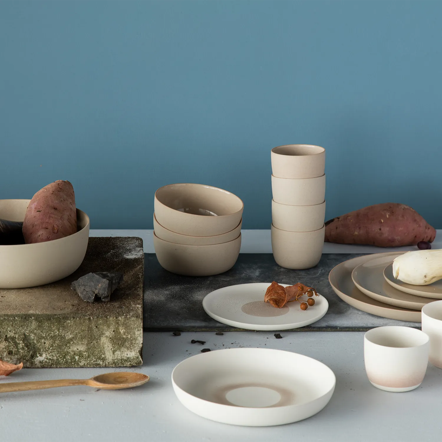 オランダのデザイナー、カースティ・ヴァン・ノートは、まず素材のリサーチからスタートしました。実際に採石場まで足を運んで、有田で使われている陶石が純度の高い特別なものだと知りました。一方、純度が低い原料はぜんぶ捨てられてるという現実も目の当たりにました。そこで彼女が目をつけたのが、まさにその「捨てられる方」の陶石。不純物が多いからこそ出せる、自然由来の美しい色合いを活かした陶土を開発しました。コレクションは2つのシリーズで展開していて、その独特な色や質感が引き立つよう、あえてシンプルなかたちにまとめています。