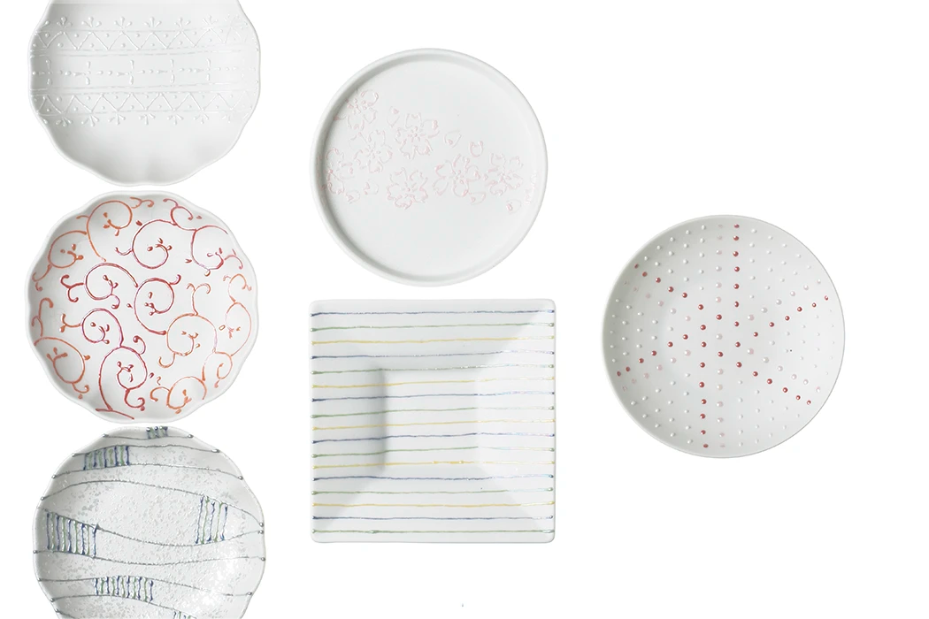 顔料で着色した化粧土(けしょうど)を、スポイトを使って絞り出しながら描く「一珍(いっちん)」技法を用いて、無釉の生地に立体的な線やドットを絵付け。明るく軽やかで、現代的な焼物を制作しています。
