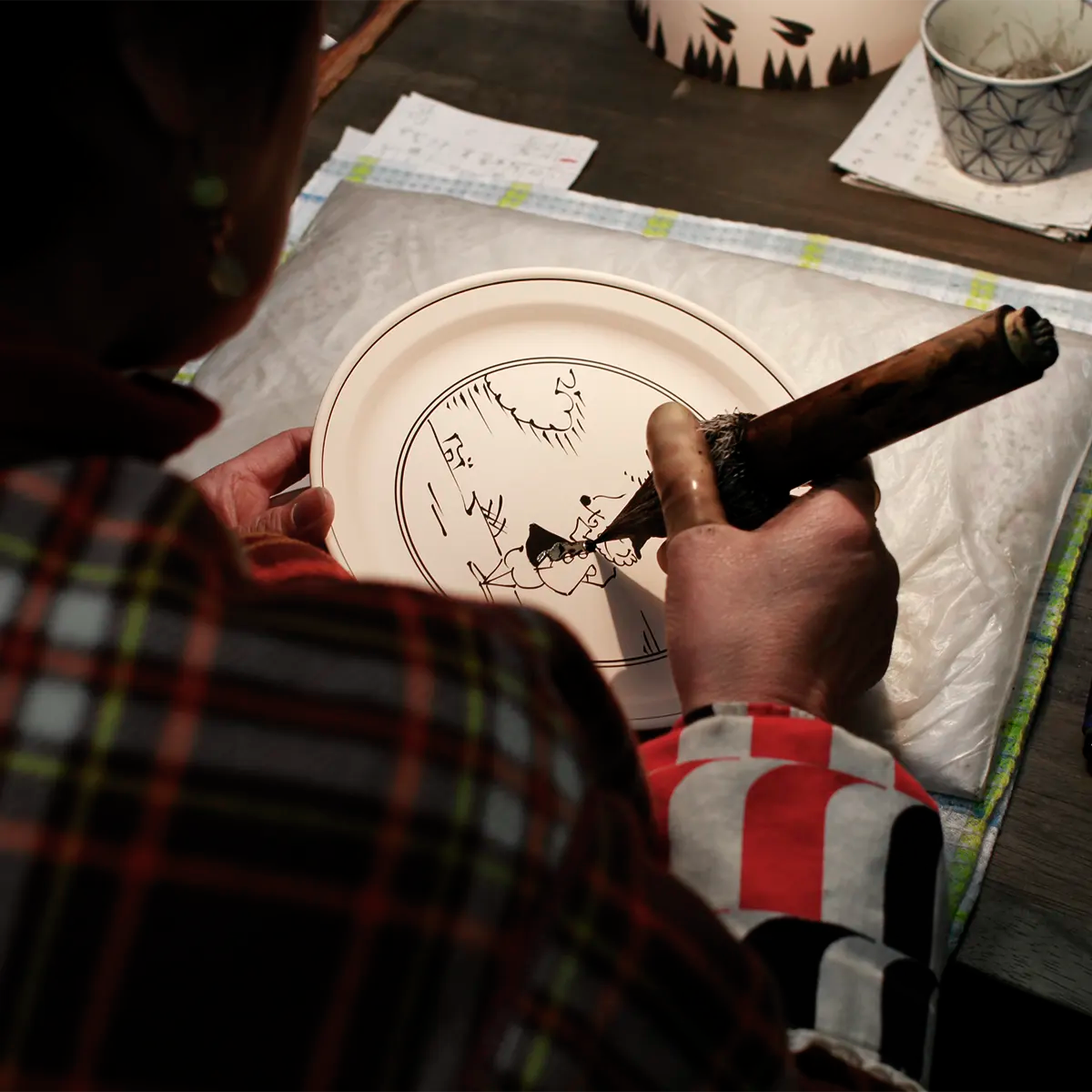 手描きにこだわり、数多くの器を世に生み出してきたしん窯。"藍色と白の染付の器"を意味する「青花」は1976年に誕生しました。なかでも代表的なモチーフとして知られる「紅毛人(こうもうじん)」。その始まりは古く17世紀、オランダの東インド会社を通じてヨーロッパに輸出していた有田焼の中に「紅毛手(こうもうで)」と呼ばれる図柄がありました。その愛くるしさに惹かれ、しん窯の絵付け師さんと試作を重ねた末に誕生してから、およそ半世紀の間ずっと愛され続けています。