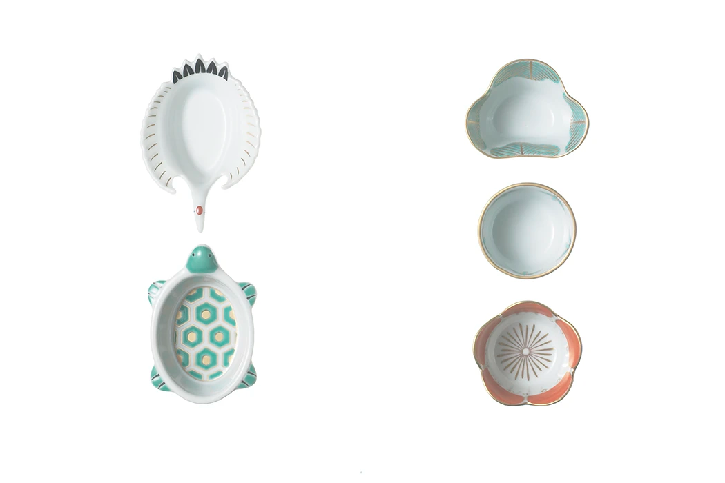 ホテルや旅館、飲食店などで使用される、松竹梅や鶴亀などの吉祥文様をモチーフにした変形豆皿の制作が得意。正月や宴会などハレの日に映える、これらの器は20年来のロングセラーです。