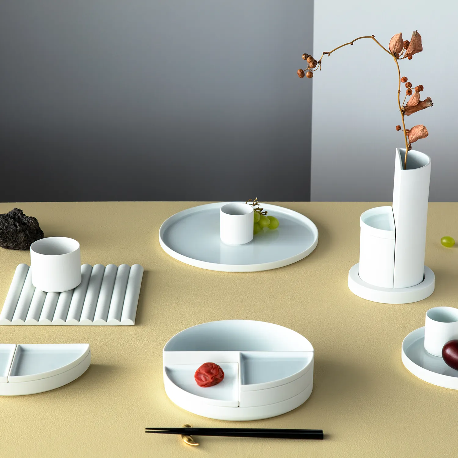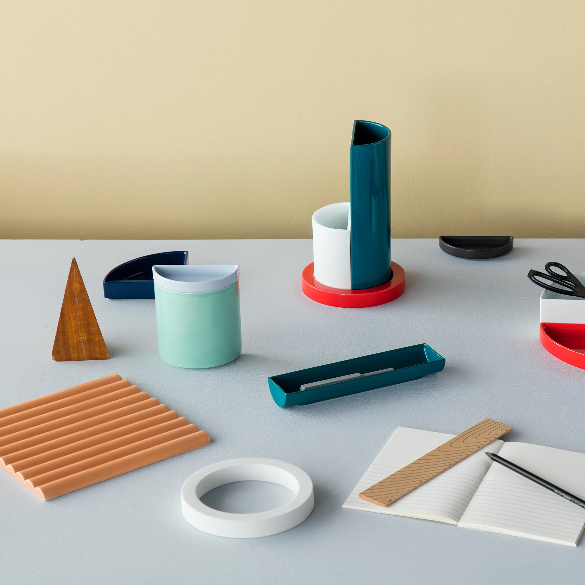 ロンドンを拠点に活動するトマス・アロンソのコレクションは、ベーシックな幾何学の形、色、サイズからなるコンテナのシリーズです。それらは、決められた機能があるのではなく、異なるコンテクスト、異なるアレンジによって機能が自在に変化します。デスクではデスク上を整理するアイテムとして、または装飾用のアイテムとして、もしくは、ダイニングテーブルで食べ物を提供するための器として、使い手によって様々な用途で使用できる現代的な器のシリーズです。