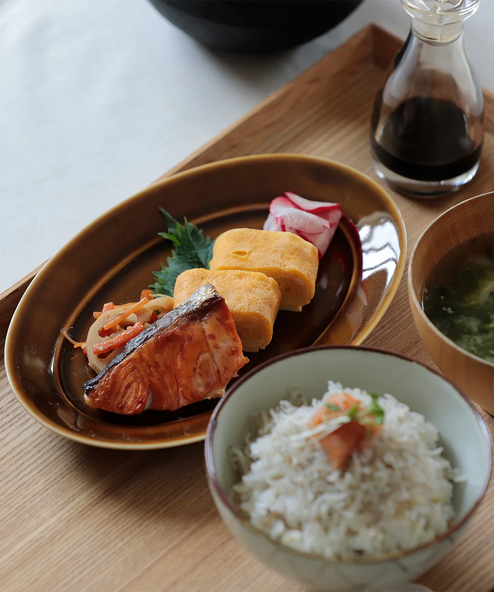しらすたっぷりのあつあつご飯。明太子と一緒に美味しくいただきました。網絵の飯碗はアイボリー調の優しい色味でご飯がより美味しくいただけます。網という絵柄は柄に終わりが無いことから縁起が良いとされています。