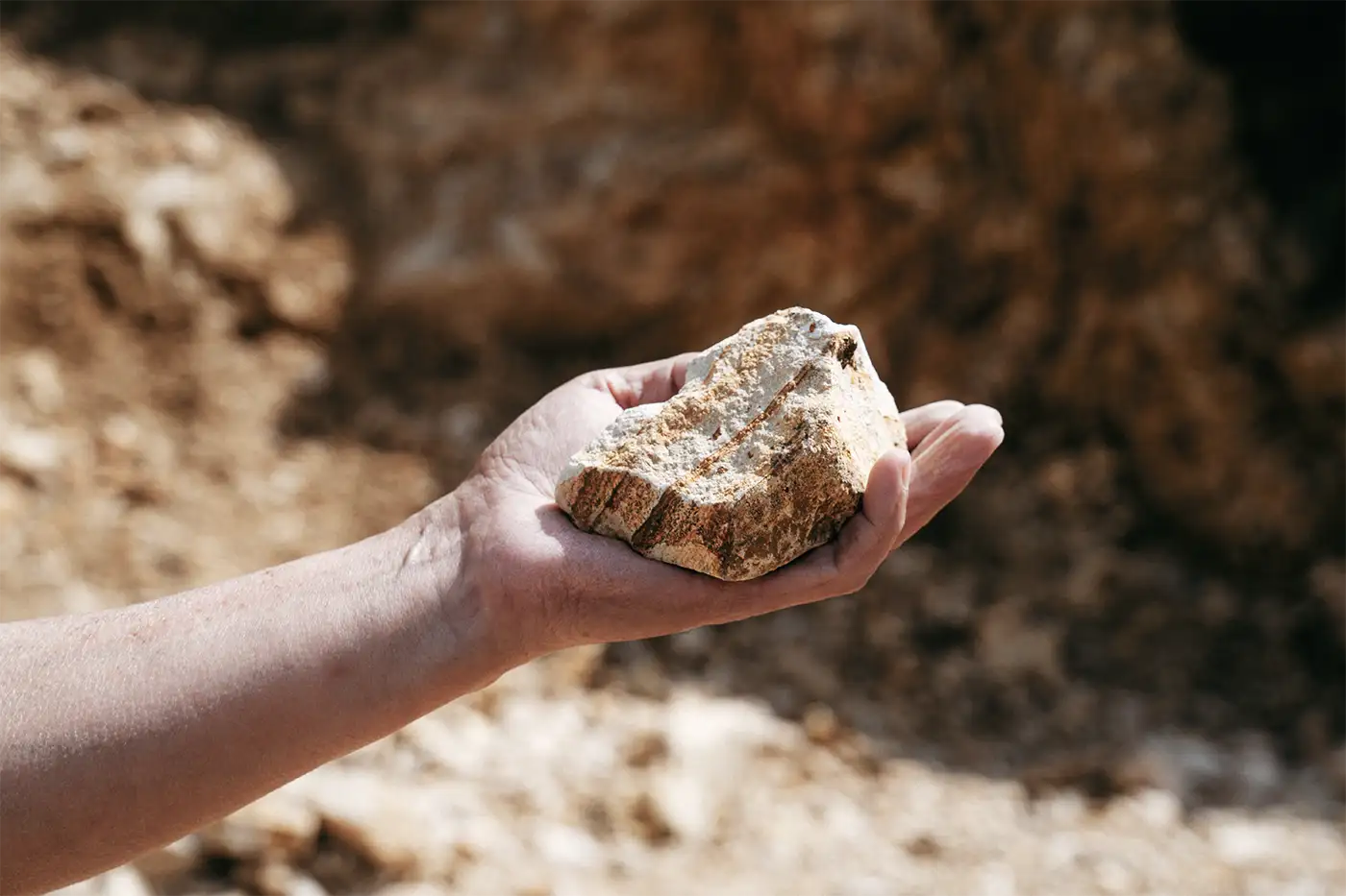 有田焼といえばまっさらな白。というイメージを想像しますが、これは陶石の鉱脈のなかでも限られた場所の石だったり、処理を重ね白くする場合もあります。そんな中、鉄分を多く含んでいるが故に産地ではあまり使われない石(縞石)に着目しました。手間をかけて白くされたお皿も良いですが、素材の魅力の捉え方は様々で鉄分が多いのも個性の一つ。弾かれるものをあえて使用し、風合い豊かな素材の表情を目指しました。