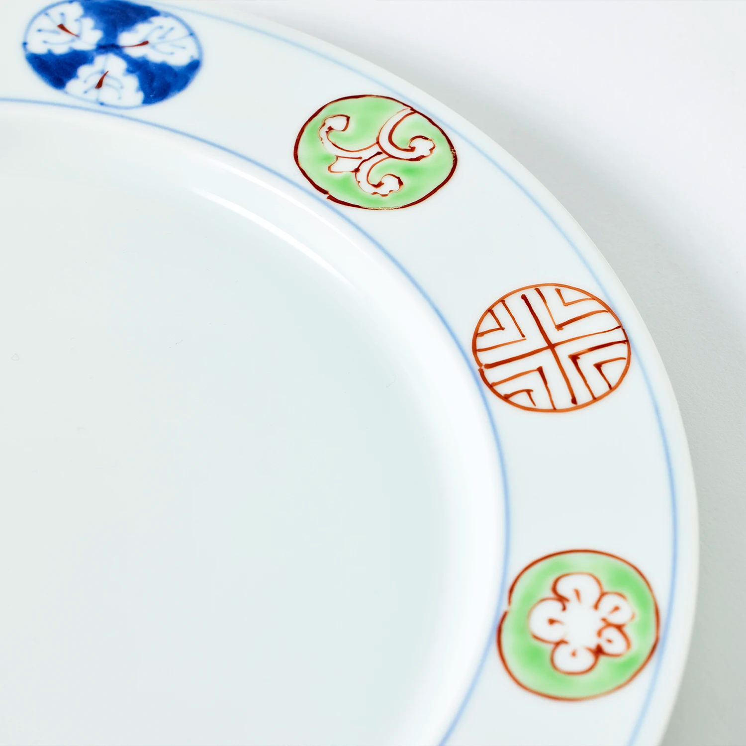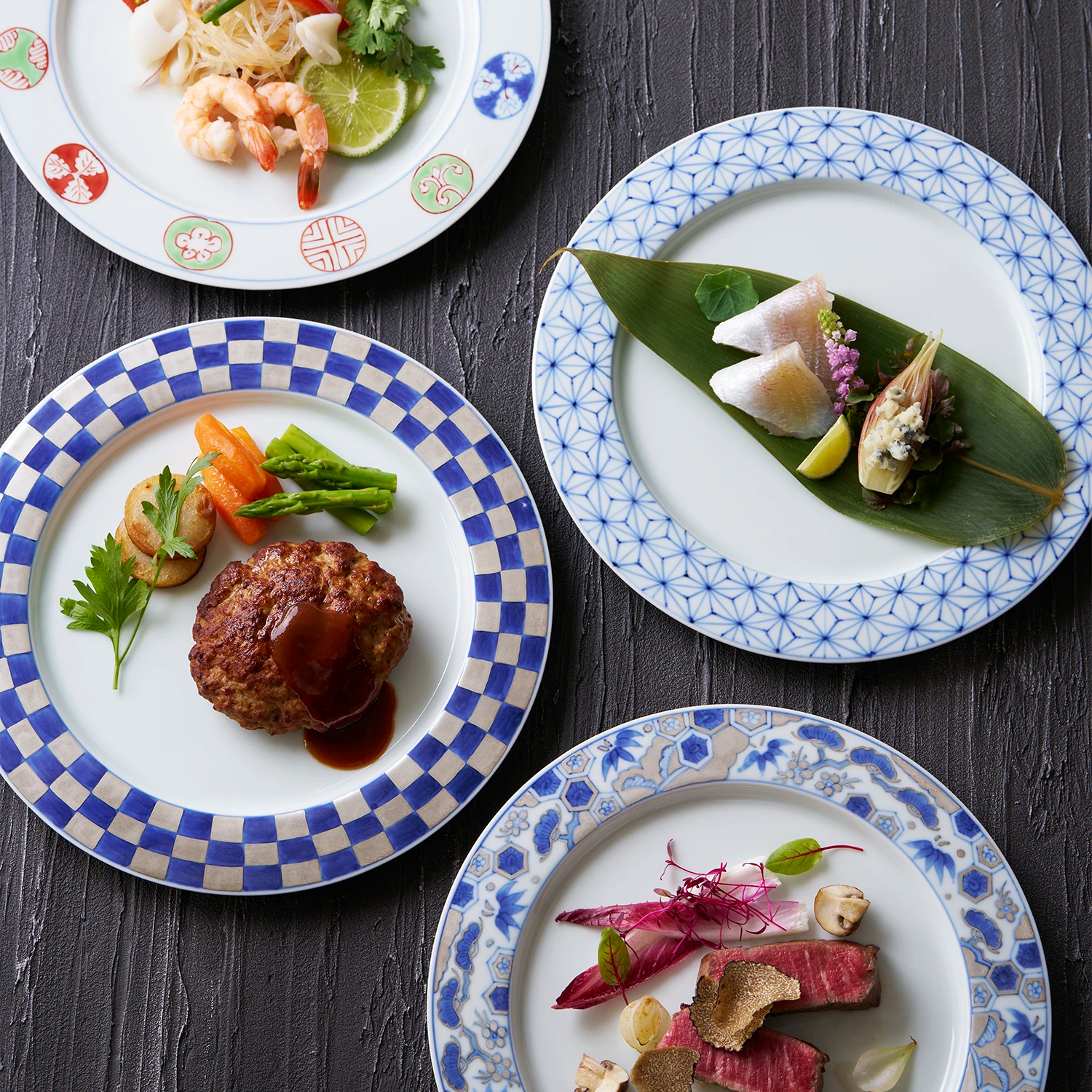 福珠窯さんの手描きのお皿です。器の名前の通り、縁起の良い絵柄がモチーフになっています。古伊万里松竹梅という紋様は古典的な手柄なのですが、銀彩と染付の組み合わせとによってモダンな印象のお皿に。銀彩は本物のプラチナを施しているので長く使うと黒ずむ場合がありますので、その場合は市販の銀磨きでお手入れされると輝きが蘇ります。洋食器にあるようなリムプレートで絵柄は和。少し特別な日のお皿として活躍してれます。